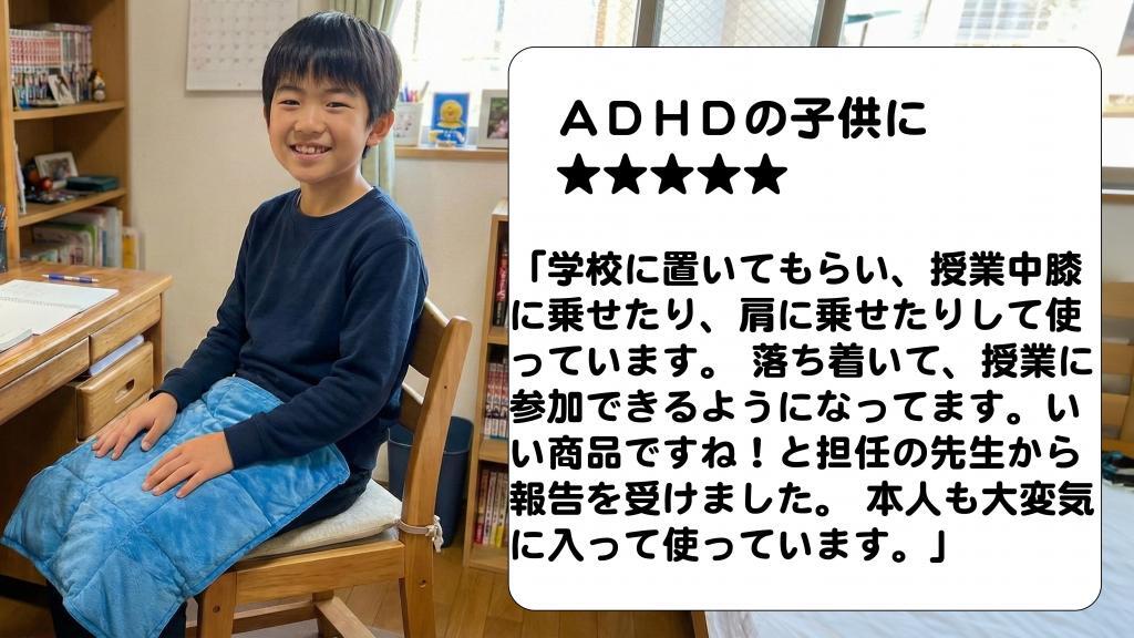 集中力が高まるかどうかまでは分からないですが、緊張がほぐれ、なんとも言えない安心感があります。同じくADHD / ASDの息子(7歳)は夜寝付くのに時間がかかる時に、自分からかけると言って足にかけています。眠りに入りやすいそうです。