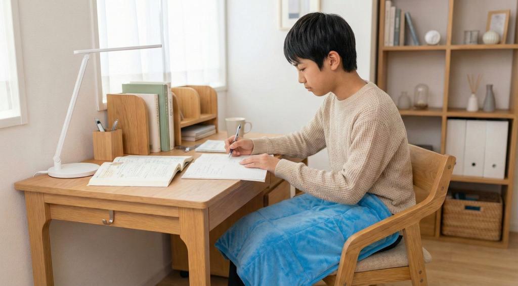 勉強を始めるとすぐに立ち上がってウロウロしてしまいがちな人は、勉強デスクに重いひざかけを常備しておくと、勉強ボディを維持する助けになります。
