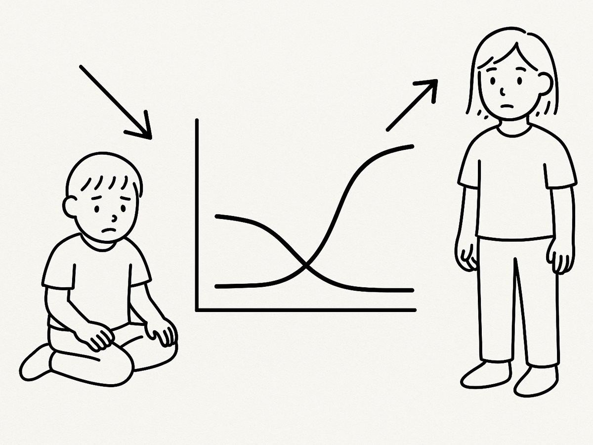 もうひとつは「後期診断型」と結びついた因子で、思春期以降に感情や行動の困難が増えていく傾向を持ち、ADHD、うつ病、PTSD、自己傷害など幅広い精神的な状態と強く関連していました。