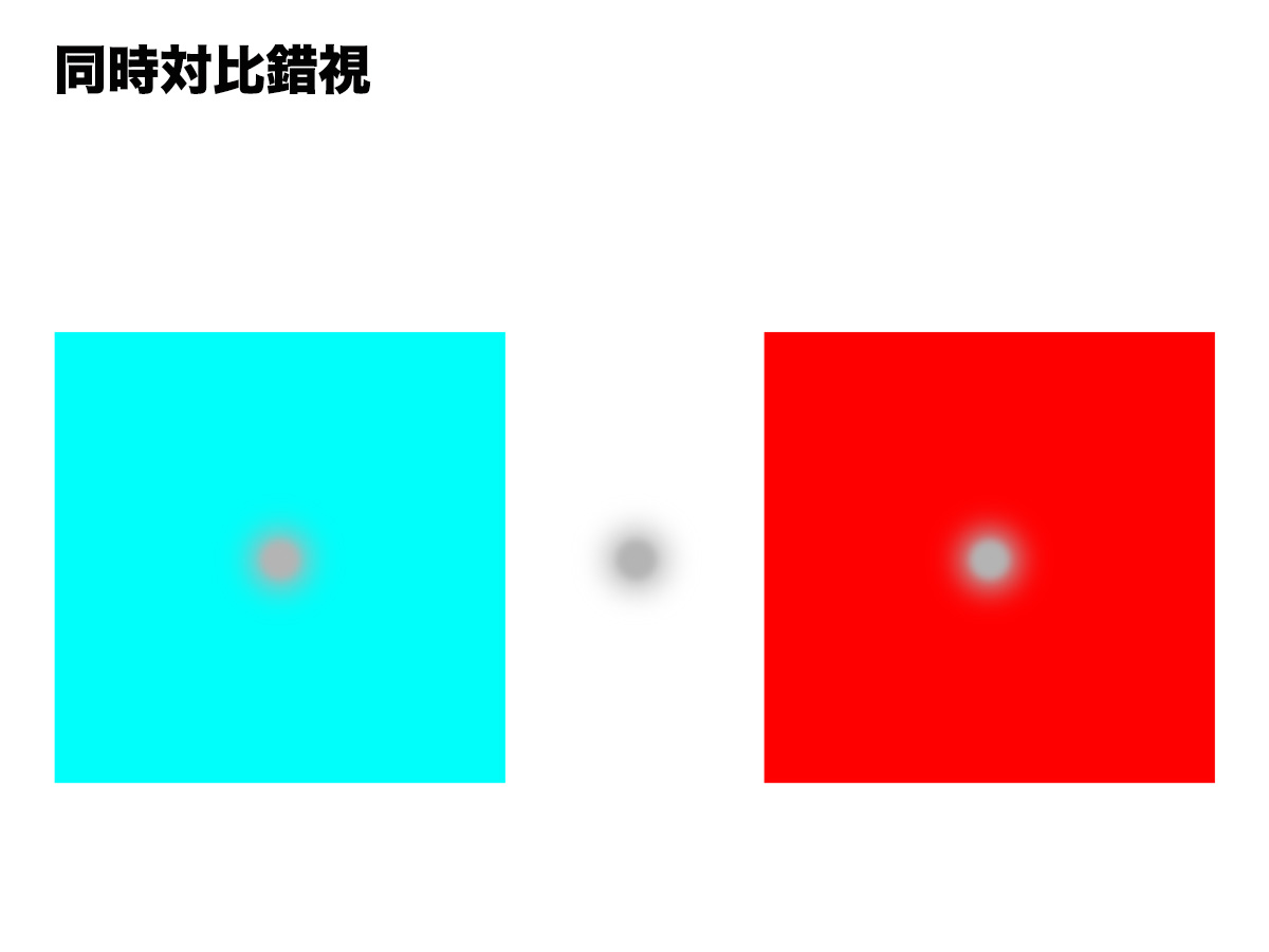 ほかに、背景の明るさによって灰色の濃さが違って見える「同時対比錯視」、
