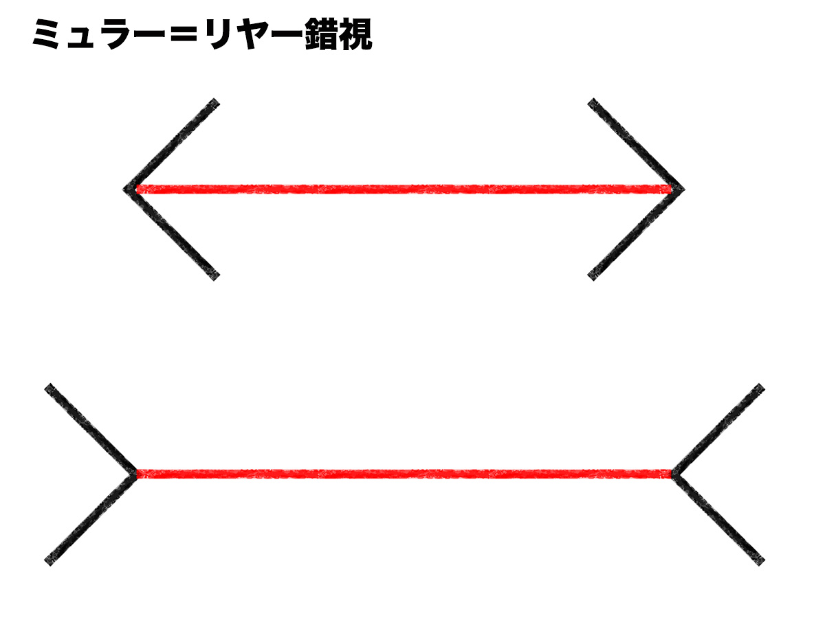 もうひとつは「ミュラー=リヤー錯視」。矢印の向きによって線の長さが変わって見える錯覚です。