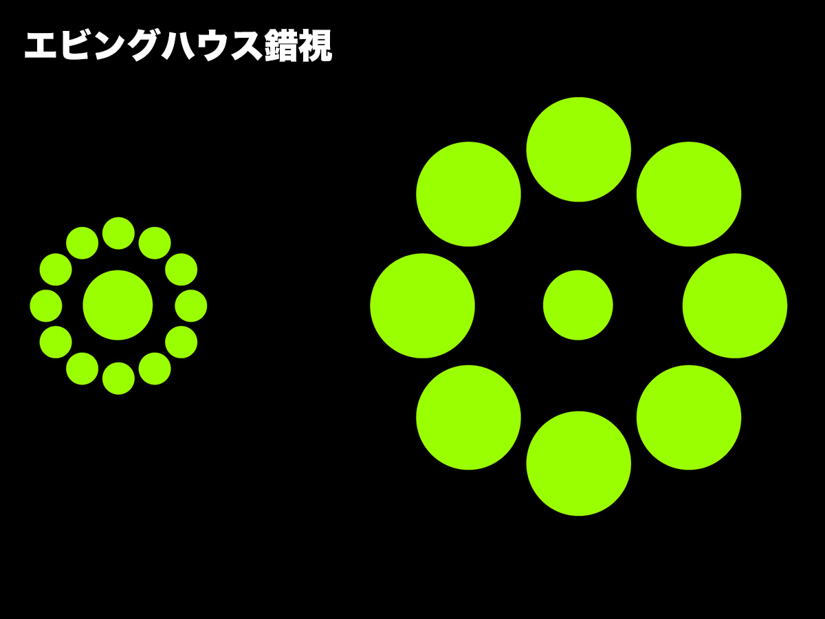 ひとつは「エビングハウス錯視」。大小の円に囲まれた中央の円の大きさが、周囲の影響で違って見えるものです。