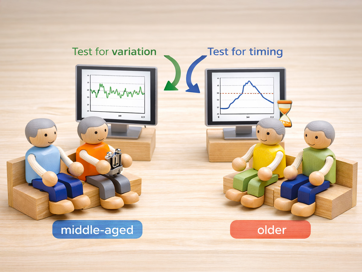 参加者を「中年層」と「高齢層」に分けて分析したところ、中年層の自閉症のある成人では、とくに「力を保つときのばらつき」が目立っていました。