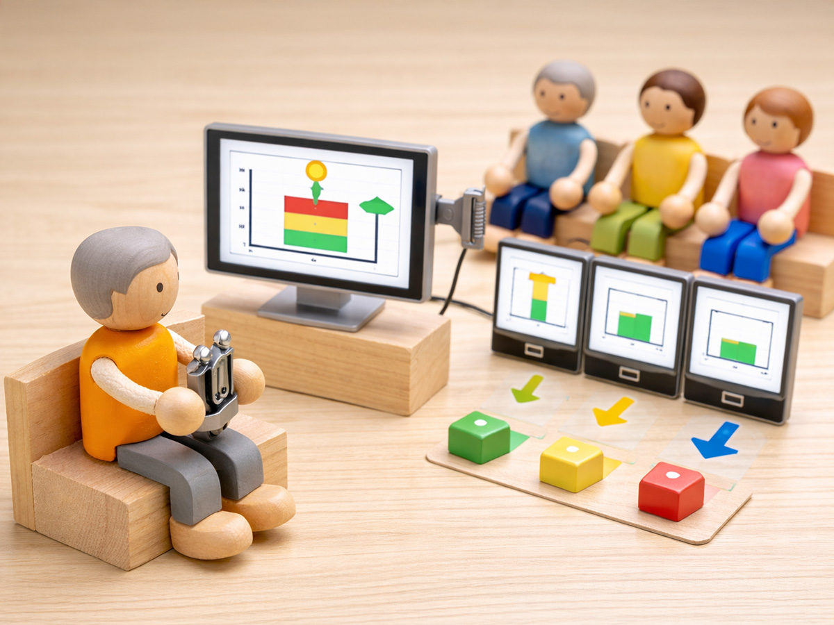 参加者は椅子に座り、画面を見ながら専用の装置をつまみます。