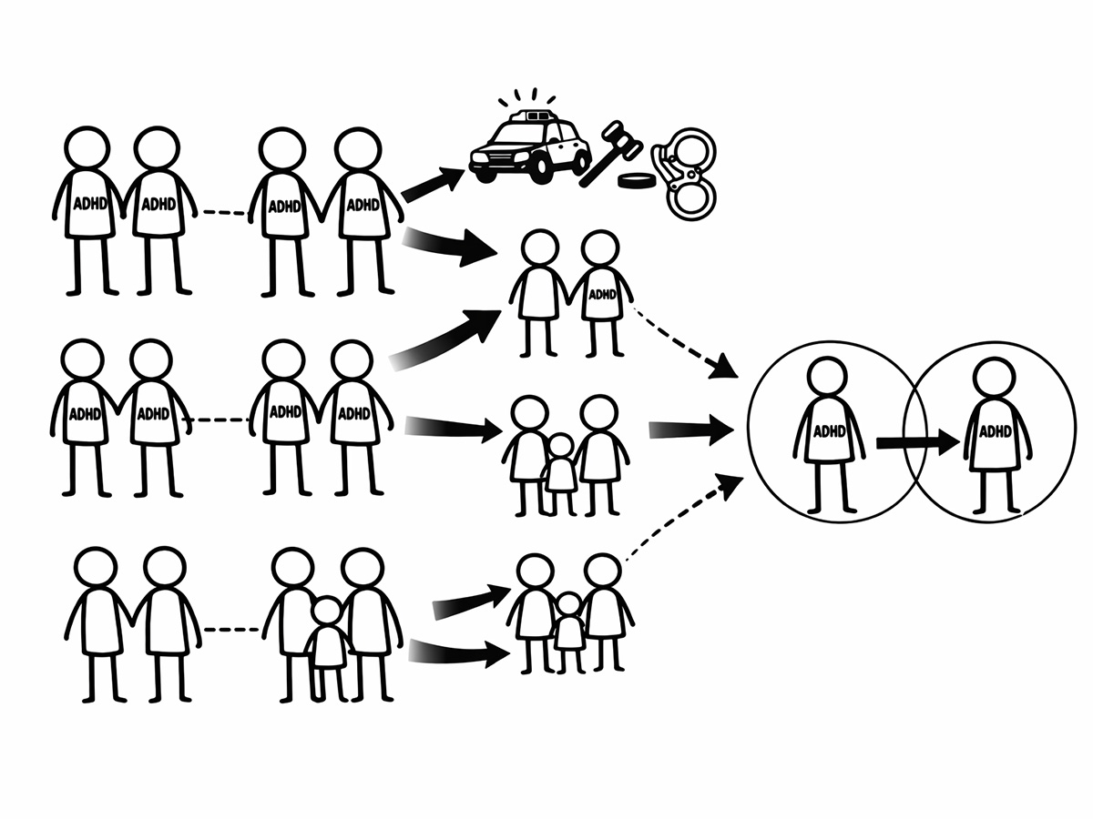 実際に分析してみると、ADHDのある人の家族は、本人にADHDがなくても、有罪判決を受けるリスクが高い傾向が見られました。