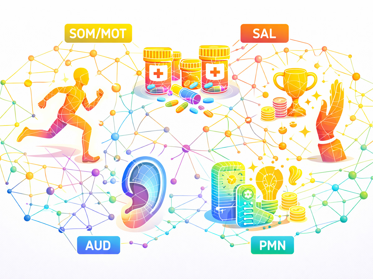 刺激薬を服用していた子どもたちでは、体の動きや行動の準備に関わる「ソマトモーター領域」や「行動・運動ネットワーク」、さらに「聴覚ネットワーク」において、脳内の結合のパターンが大きく変化していました。