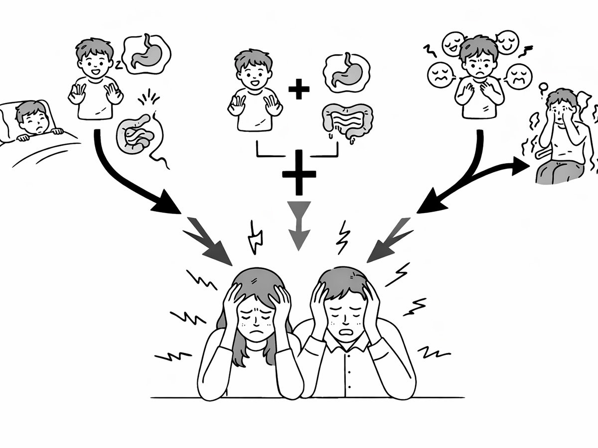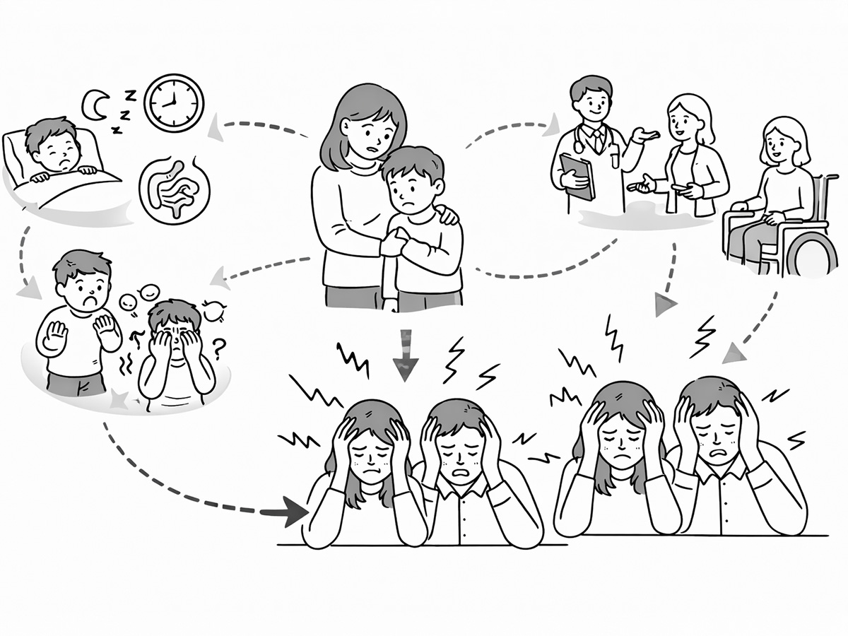 たとえば、消化器系の不調や睡眠障害があることで、こだわり行動や情緒の不安定さが強くなり、それが親の負担を増やす、というイメージです。