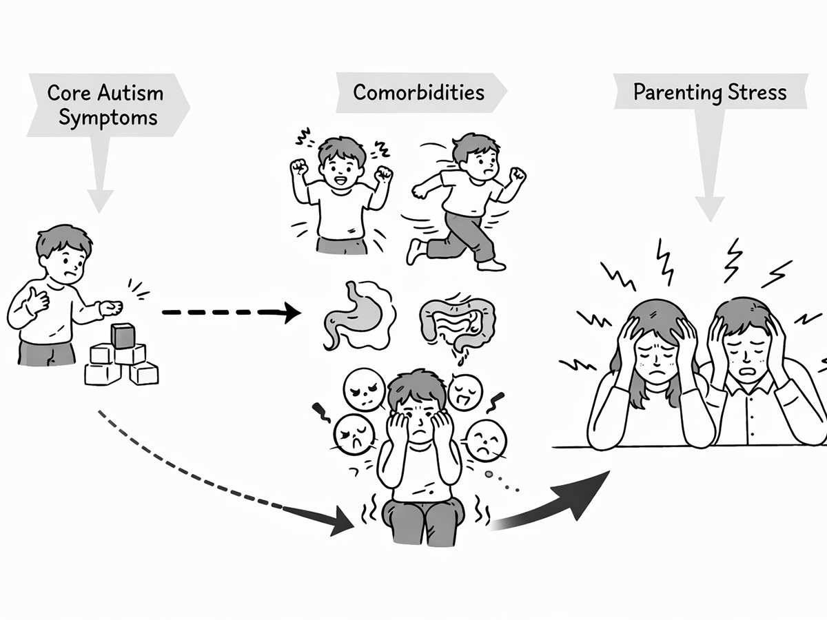 自閉症のある子どもは、不安、ADHD、知的障害、睡眠の問題、消化器系の不調など、さまざまな併存状態を同時に経験していることが多いと報告されています。