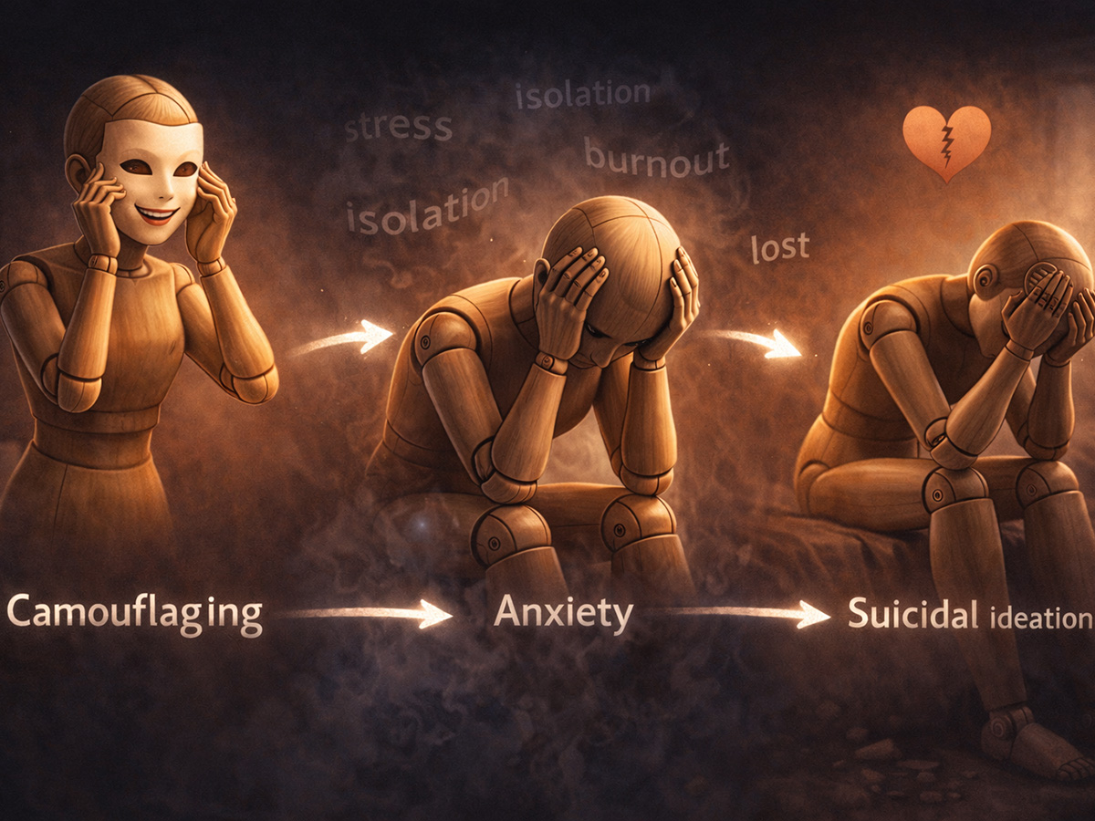 とくに重要なポイントは、「カモフラージュ(カモフラージング)」と呼ばれる行動と、不安、そして自殺念慮とのあいだに、密接なつながりが見られたことです。