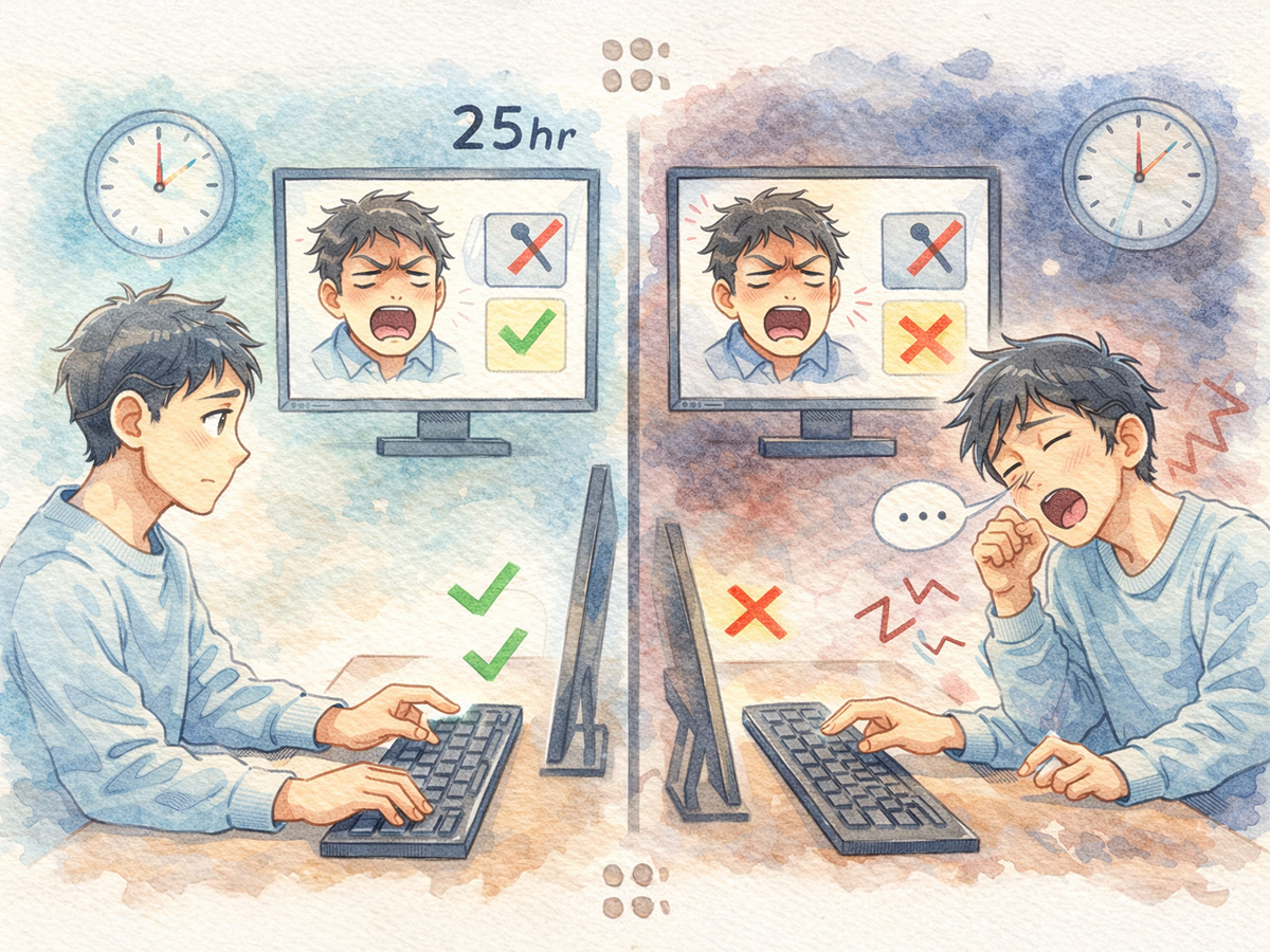 - 睡眠不足で怒った顔の押し忘れ・押し間違い・反応時間のばらつきが増え、補償が不十分になりやすいです。