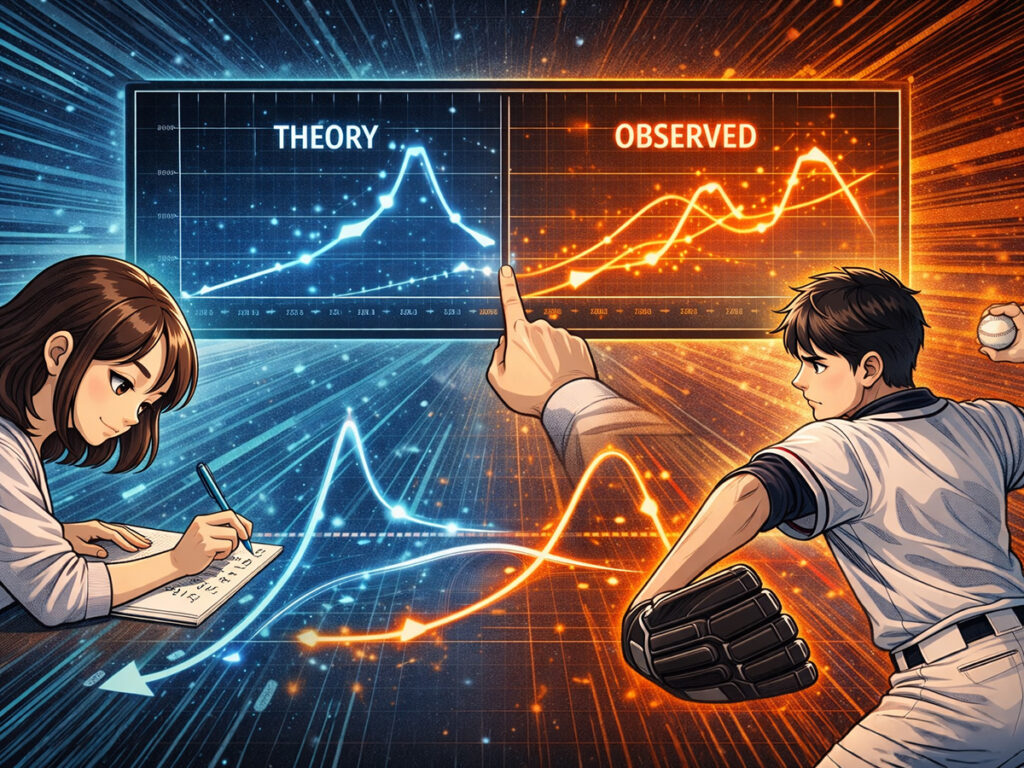 理論上の数学モデルが予測する値と、実際に観察された値は、両群とも完全には一致していませんでした。