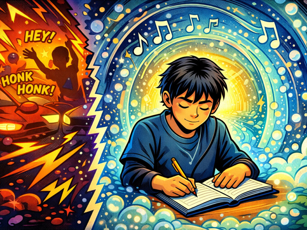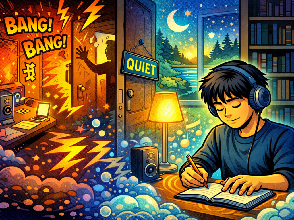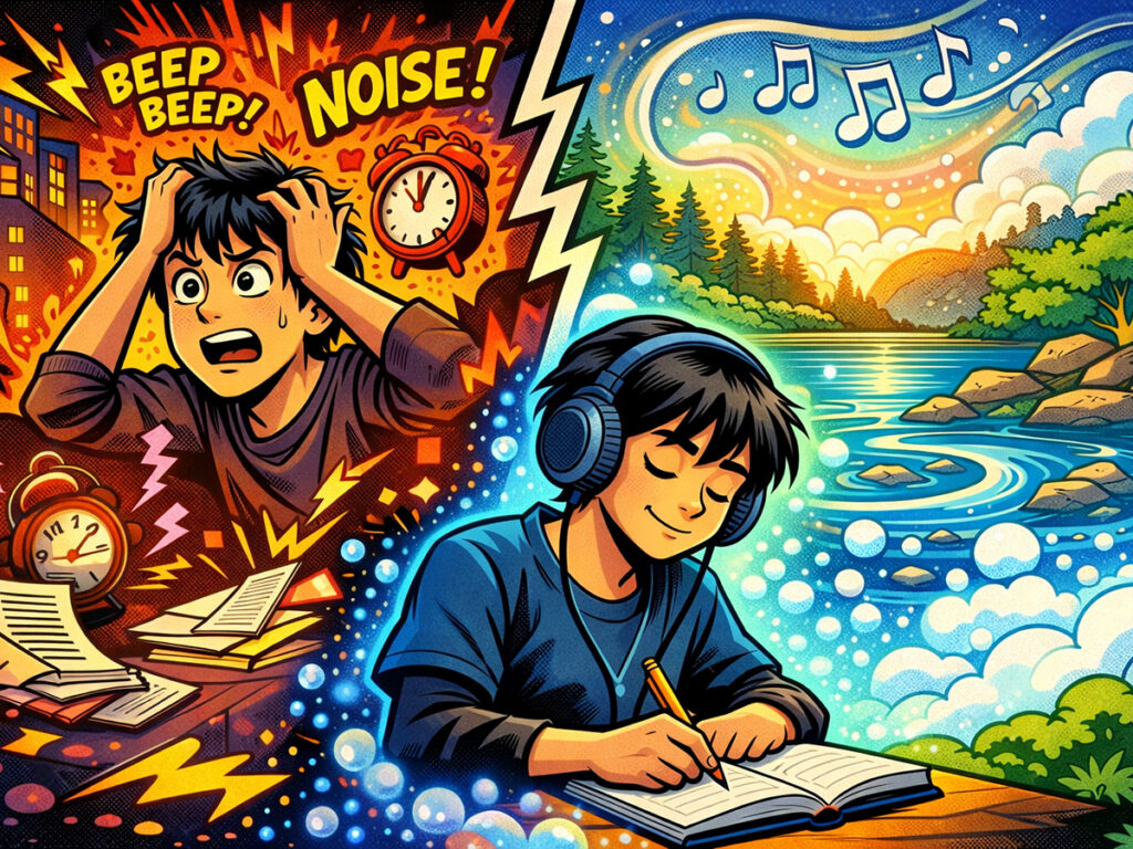 同じ音楽を繰り返し流したり、自然音を重ねたりすることで、外の刺激を遮る方法です。