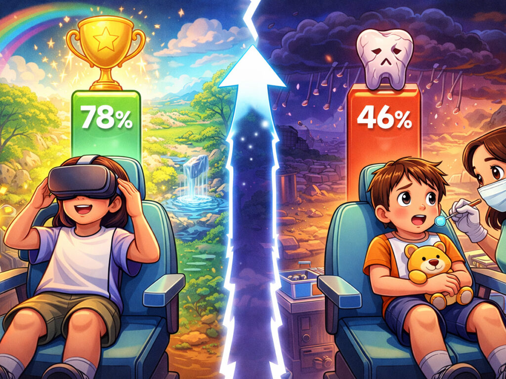 - 記事の研究では、VRを使った群で約78.6%が予定時間内に治療を最後まで終えられ、モニター群の46.4%より高い結果でした。